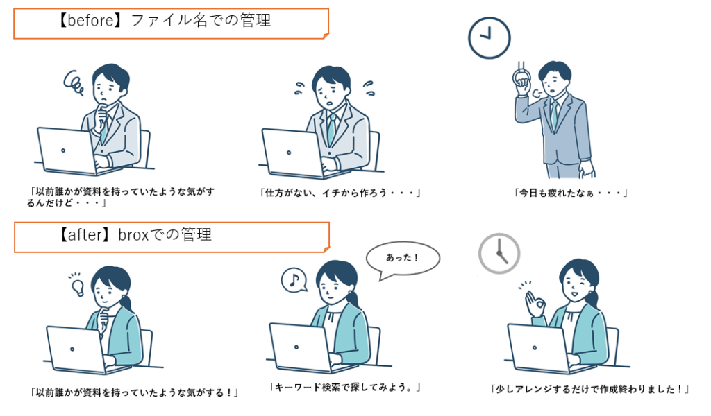 broxは、「整理しきれなくても、検索できればいい」といった現実的な考え方で本来の目的を達成し、文書管理の負担を大きく減らします。