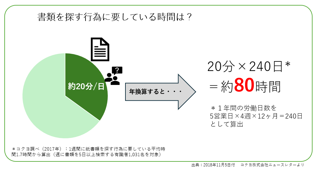 2018年のコクヨ株式会社の発表によると、会社員は1日に平均して約20分、紙の書類を探しているという結果になりました。1年間に換算すると、約80時間。これはまるまる10営業日分の時間が「探す作業」に消えている計算です。