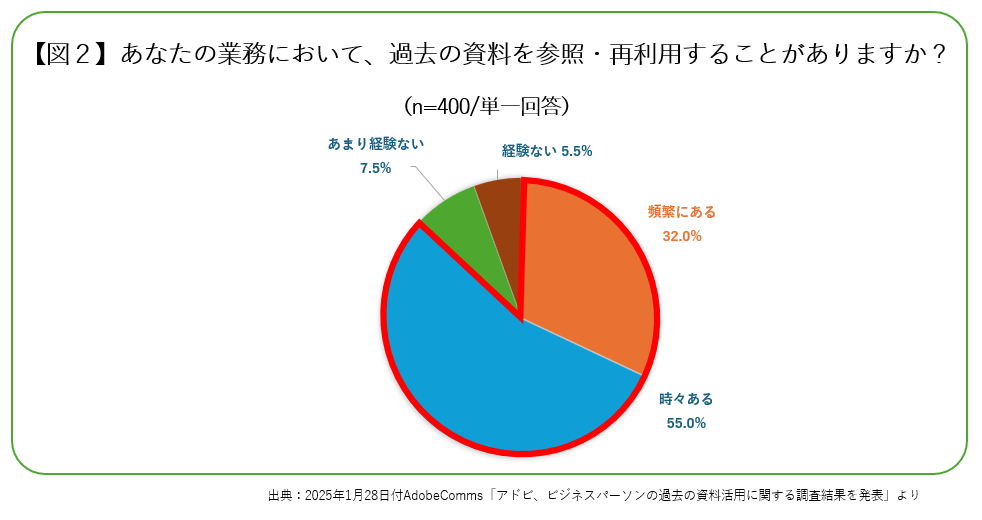 2024年にアドビ株式会社が自社の社員(社内資料をデジタル管理しているデスクワーカー400名(フロントオフィス従事者200名/バックオフィス従事者200名))を対象に、「ビジネスにおける過去資料の活用状況」に関する調査を行いました。