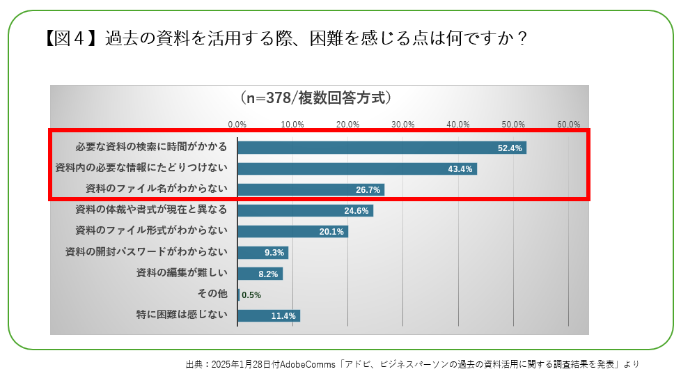 そして、過去の資料を活用する際に困難に感じる点を聞いたところ、「必要な資料の検索に時間がかかる(52.4%)」と「資料内の必要な情報にたどりつけない(43.4%)」、「資料のファイル名がわからない(26.7%)」の順に困難を感じていることが分かったのです【図4】。
