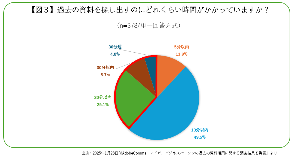【図2】87%の社員が過去の資料を参照・再利用することがあると回答し、【図3】その資料を探し出すために40%近くの社員が10分以上の時間を費やすとの回答になりました。