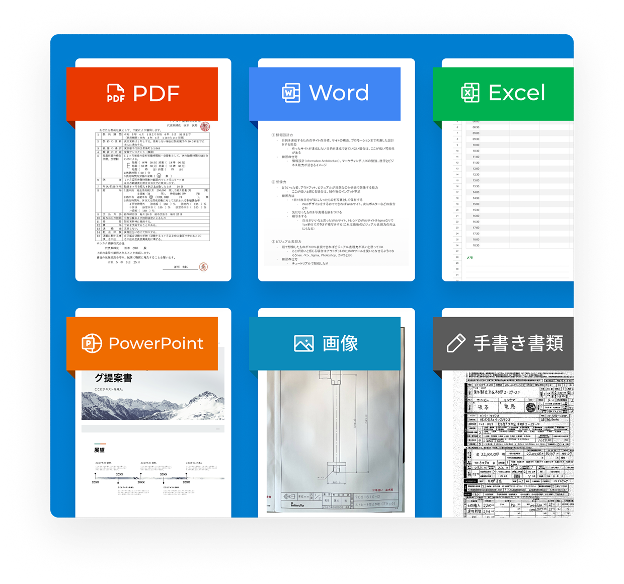 PDFや画像データ、Word/Excel/PowerpointなどのOffice系ファイル、さらには手書き書類まで、様々なファイル形式のテキスト検索に対応しています。ファイル形式に煩わされることなく、必要な情報をスピーディに見つけ出すことができます。